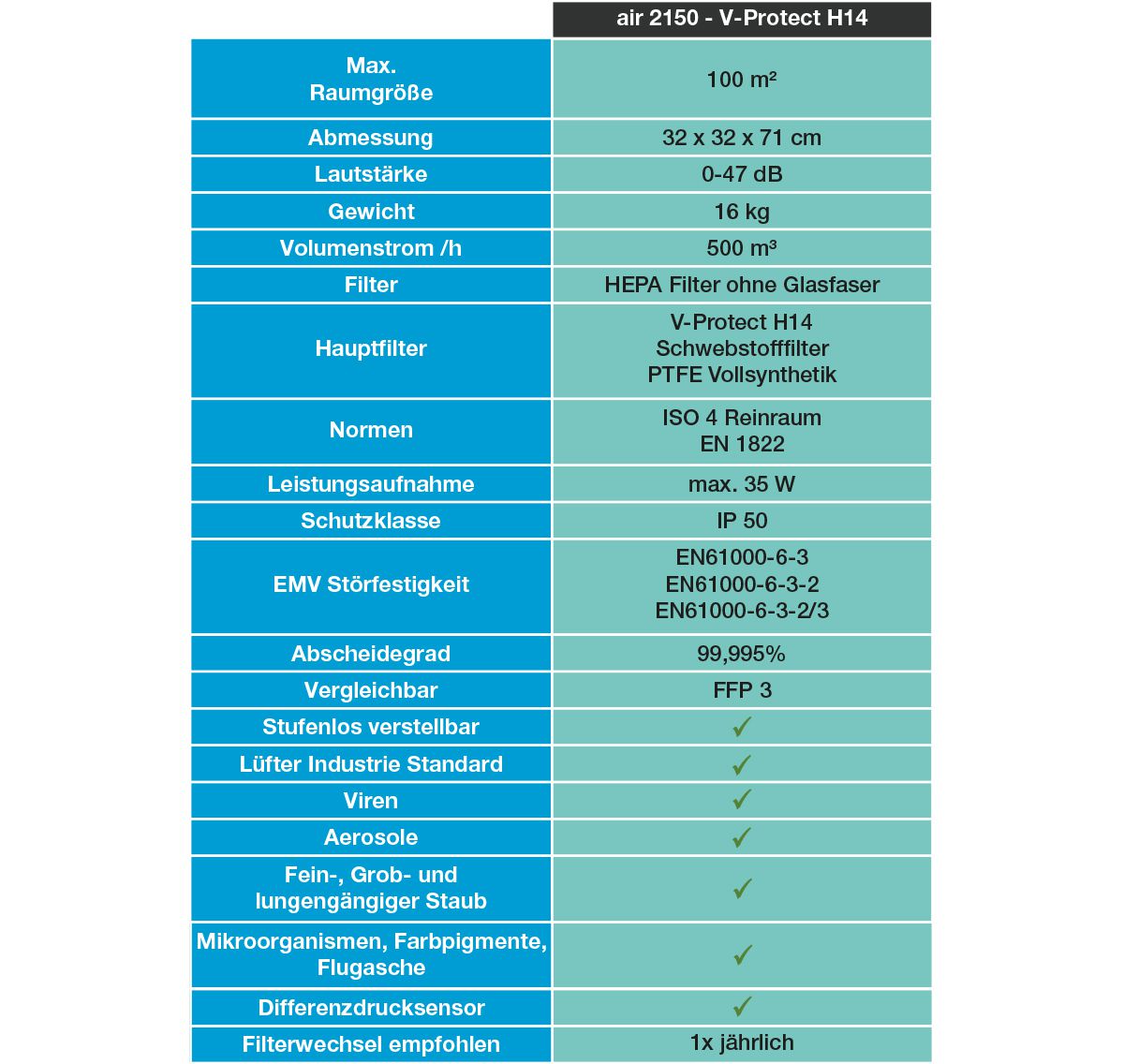 Wir garantieren Ihnen ein optimales Klima durch leistungskräftige Feinstaubfilter, die zu 100 % aus Synthetik-Material bestehen. Zusätzlich arbeiten die Filter komplett ohne Glasfaser und sind somit vollkommen unbedenklich.